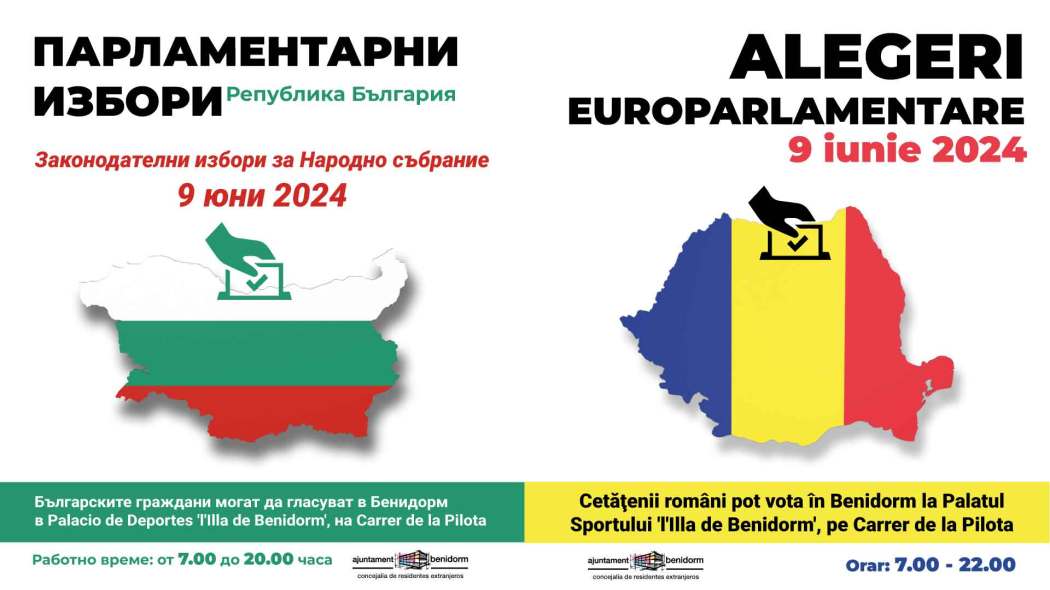 Para los electores de Rumanía, el centro de votación estará operativo desde las 07.00 hasta las 22.00 horas, y la de Benidorm es una de las cuatro sedes electorales de la provincia de Alicante y de las 20 habilitadas por el Consulado en toda la Comunidad Valenciana. En el caso de los ciudadanos búlgaros, podrán votar entre las 07.00 y las 20.00 horas. Desde el Consulado de este país se han establecido 23 sedes electorales para Comunidad Valenciana, región de Murcia, Castilla-La Mancha e Islas Baleares.