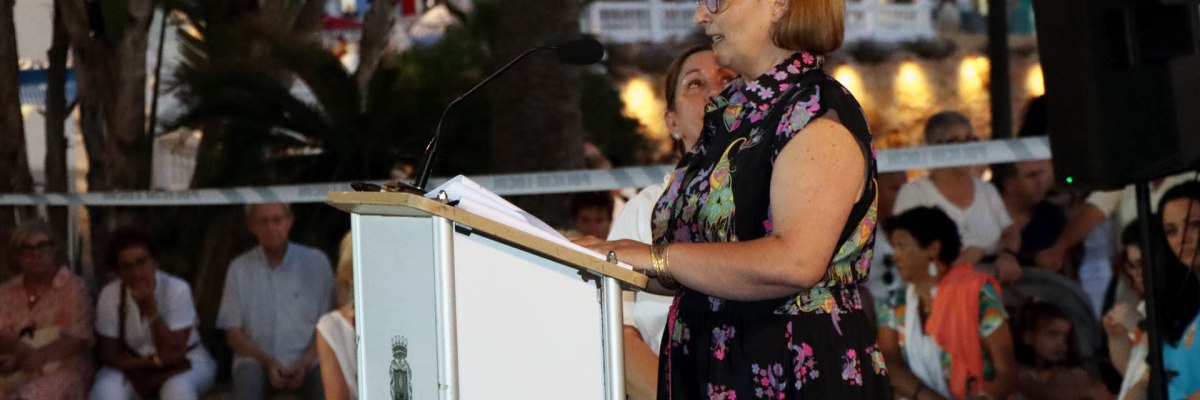A continuación, fue el turno del pregón de Ana Llambrich López, que ante la atenta mirada de todos los presentes dio lectura a un emotivo texto donde recordó cómo su padre, ‘El Català’, fue uno de los artífices de que se recuperase esta fiesta tras años sin celebrarse y cómo surgió la idea de que una niña de la comisión recitase un verso a la Virgen del Carmen, siendo ella misma la primera en pronunciarlo, entonces vestida de ángel. Igualmente, la pregonera recordó cómo eran en su época de niña los actos más tradicionales de esta fiesta, las noches de verbena, las despertàs del domingo o cómo los vecinos y otras entidades festeras se volcaban con El Carmen, para finalizar recitando parte de aquel verso y recordando a personas que ya no están, entre ellos a Pepita Esperanza Llinares, con la que aprendió aquel poema para la Virgen.