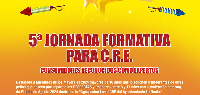 La quinta “Jornada Formativa en Petardos para Consumidores Reconocidos como Expertos (C.R.E.)” será el viernes 26 de julio a las 18 horas en la Sala Ponent de l’Auditori de La Nucia. Curso destinado a los Majorals 2024 y festeros de otras penyes de La Nucía, (únicamente de La Nucía) que deseen participar las “Despertaes 2024 de les Festes d’Agost”. Curso gratuito, que será impartido por el experto y responsable de la Agrupación CRE, Agustín Rubio. Es imprescindible rellenar hoja de inscripción https://forms.gle/Tyvr3CMk6FHj86jBA antes del 24 de julio a las 12 horas.