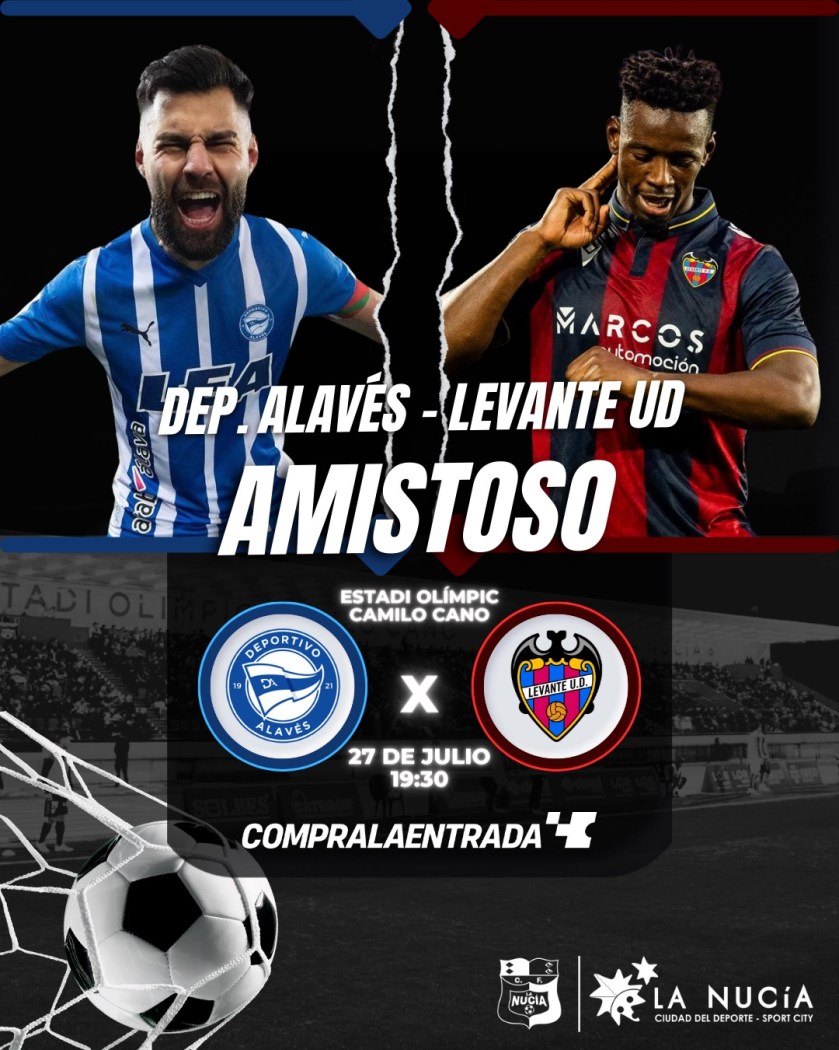 El próximo sábado 27 de julio a las 19,30 horas en el Estadi Olímpic Camilo Cano se enfrentarán el Deportivo Alavés, equipo de Primera División, y el Levante U.D, equipo de Segunda División. Las entradas para este partido amistoso de fútbol se pueden adquirir a través https://cflanucia.compralaentrada.com/eventos/