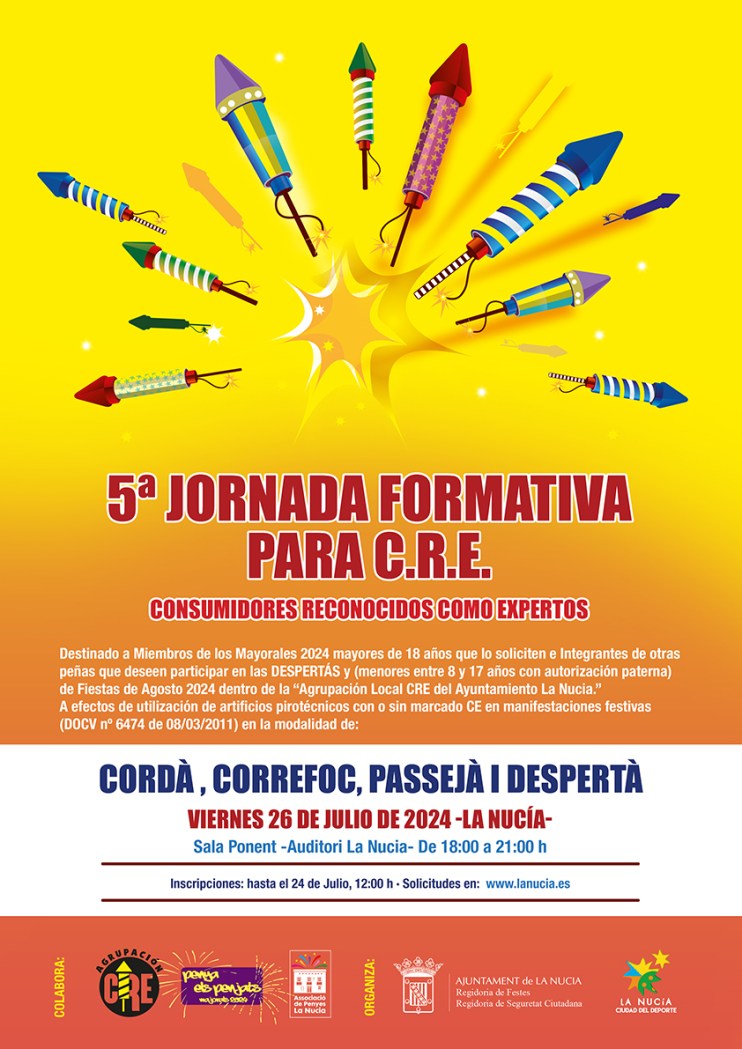 La quinta “Jornada Formativa en Petardos para Consumidores Reconocidos como Expertos (C.R.E.)” será este viernes a las 18 horas en la Sala Ponent de l’Auditori de La Nucia. Curso destinado a los Majorals 2024 y festeros de otras penyes de La Nucía, (únicamente de La Nucía) que deseen participar las “Despertaes 2024 de les Festes d’Agost”. Curso gratuito, que será impartido por el experto y responsable de la Agrupación CRE, Agustín Rubio. Es imprescindible rellenar hoja de inscripción https://forms.gle/Tyvr3CMk6FHj86jBA antes de hoy 24 de julio a las 12 horas.
