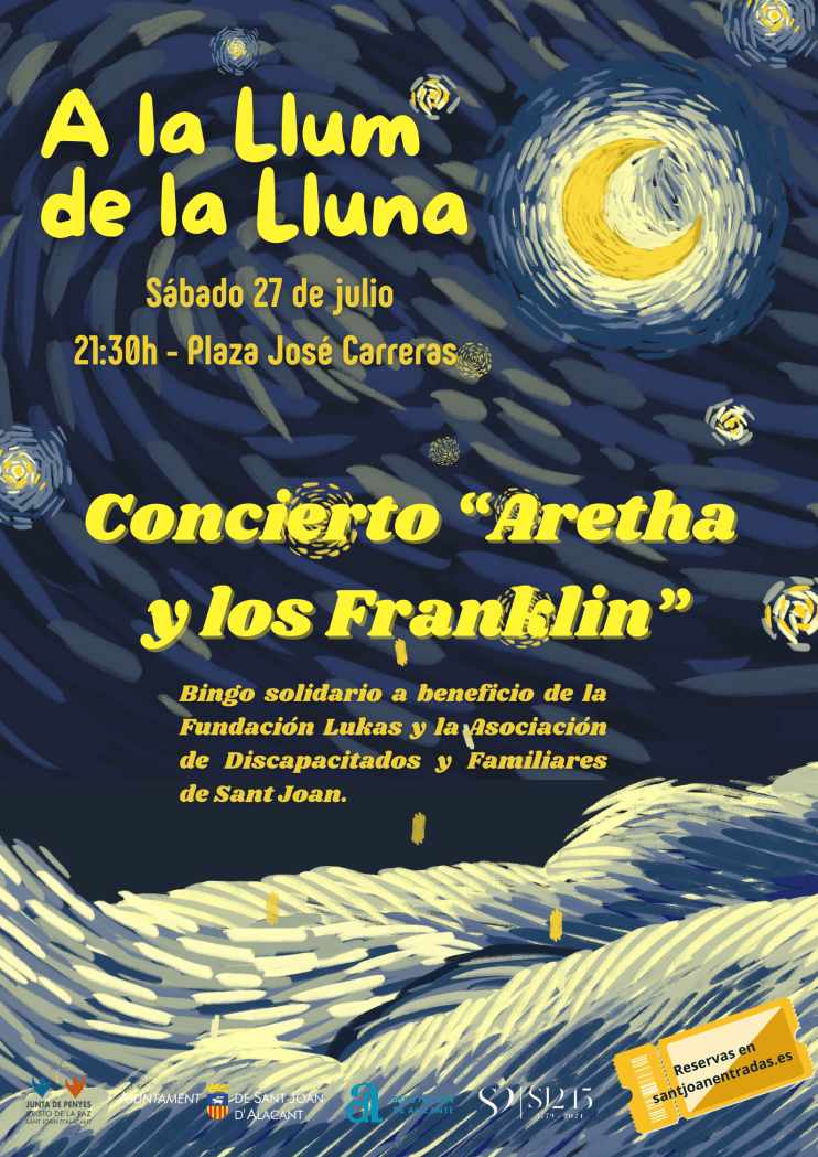 Un verano más, la Plaça Josep Carreras acoge la velada ‘A la llum de la lluna’, un evento musical, festivo y solidario organizado por la Concejalía de Cultura de Sant Joan d’Alacant donde se puede disfrutar de la música al tiempo que cenas a la fresca y colaboras con una buena causa. El sábado 27 de julio, a partir de las 21:30 horas, comenzará el evento que cuanta con la colaboración de la Junta de Penyas Cristo de la Paz y en el que se celebrarán actividades solidarias a beneficio de la Fundación Lukas y la Asociación de Discapacitados y Familiares de Sant Joan.
