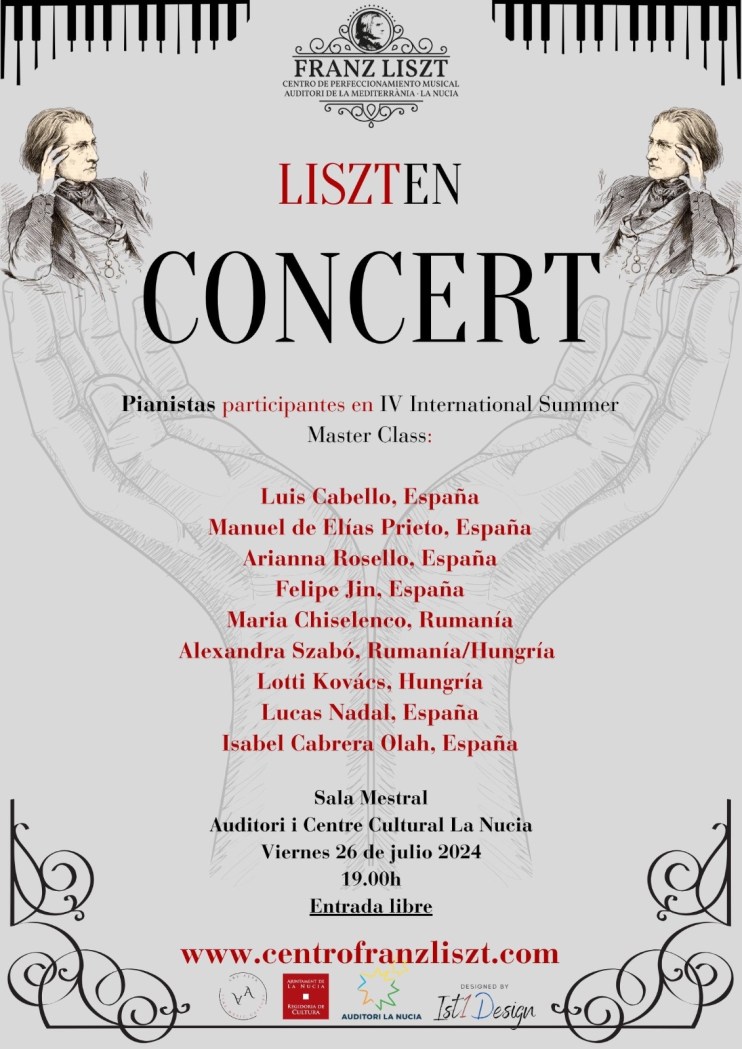 Esta tarde a las 19 horas se realizará el concierto final “Liszten Concert”, con los 7 alumnos participantes en esta edición de 2024. En él se interpretarán obras para piano de Béla Bartók, W.A. Mozart, Leo Weiner, Ludvig van Beethoven, Frédéric Chopin, Johann Sebastian Bach o Manuel de Falla, entre otros. Piezas seleccionadas para cada uno de los 7 alumnas y alumnos que están perfeccionando su formación durante toda esta semana en La Nucía.