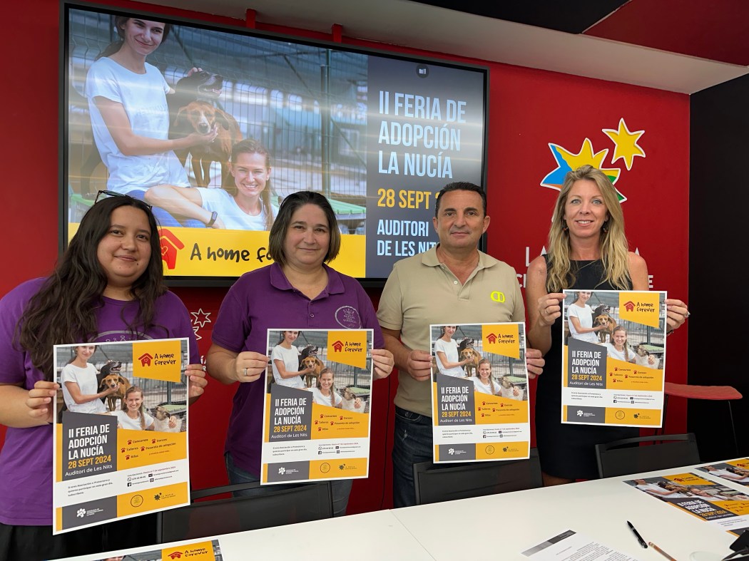 La presentación de esta II Feria de Adopción Animal contó con la presencia de Nuria López García y Anne Prieto Buades de la Asociación “Reinas del Biberón”, Jessica Gommans, concejala de Protección Animal y Bernabé Cano, alcalde de La Nucía.