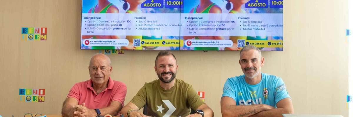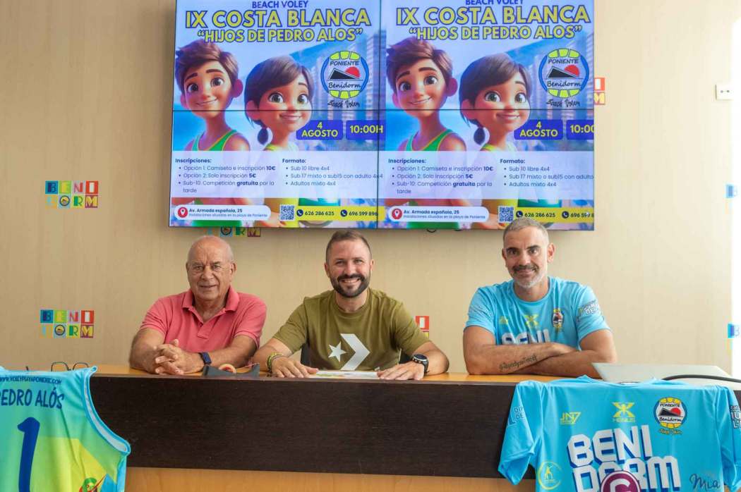 Este próximo domingo 4 de agosto la zona deportiva de la playa de Poniente de Benidorm acogerá la novena edición del Costa Blanca Beach Vóley ‘Hijos de Pedro Alós’, un evento deportivo que ha sido presentado esta mañana en rueda de prensa en el Ayuntamiento local con la presencia del concejal de Deportes, Javier Jordá, el propio Pedro Alós y el ex olímpico Raúl Mesa, presidente del Club Vóley Playa Poniente Benidorm.