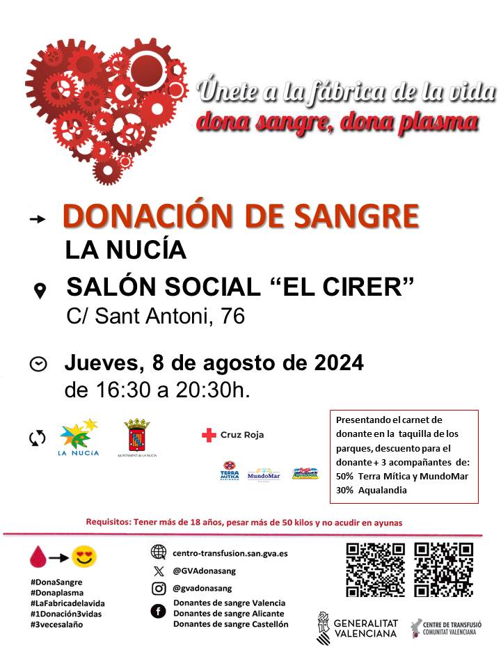 El Centro de Transfusión de la Comunitat Valenciana se desplaza a La Nucía el próximo jueves 8 de agosto para realizar la décima captación de sangre de 2024. Los requisitos generales para donar sangre son ser mayor de 18 años y menor de 65 años y pesar más de 50 kilos. Es imprescindible beber abundantemente y comer antes de donar sangre y se puede donar, aunque se tenga el colesterol elevado.