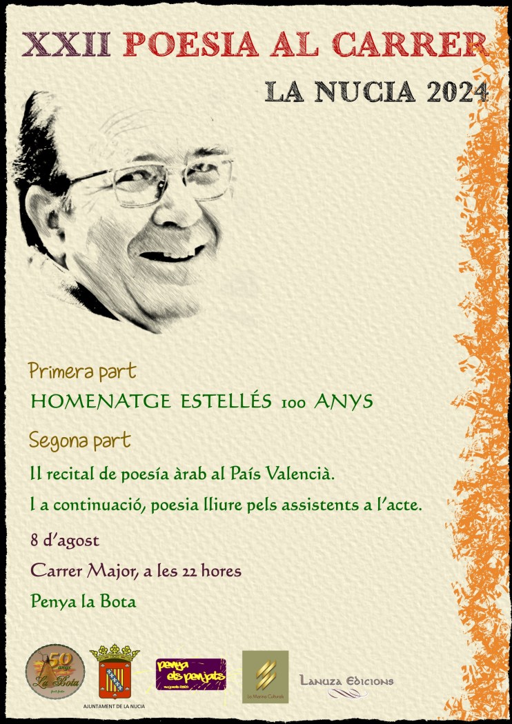 El “XXII Encontre de Poesia al Carrer” está organizado por Lanuza Edicions y la penya la Bota con la colaboración de las concejalías de Cultura y Fiestas del Ayuntamiento de La Nucía y els Majorals 2024 Penya Els Penjats. La entrada a este encuentro de poesía es libre y gratuita.