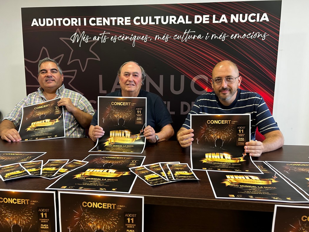 Esta actuación está organizada por la Unió Musical La Nucía (UMLN) y las concejalías de Cultura y Fiestas La presentación del “Concert XLIII Aniversari de la Unió Musical La Nucia” ha contado con la presencia de Ramón Lorente, director Unió Musical La Nucía, Juan José Ivorra, pte. Unió Musical La Nucía y Pedro Lloret, concejal de Cultura.