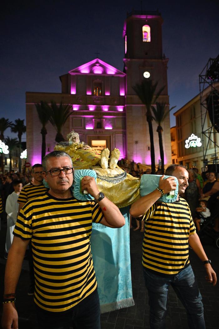 Por unas horas, los festeros y vecinos de La Nucía dejaron en sus casas las camisetas y atuendos festeros para vestirse con sus mejores galas para participar en el acto religioso más importante de “les Festes d’Agost”: la procesión en honor a la “Mare de Déu de L’Assumpció” y “Sant Roc”. Esta procesión se celebra cada año el 15 de agosto día de la Mare de Déu de l’Assumpció, pero a la imagen de la virgen de agosto le acompaña Sant Roc al celebrarse la festividad el 16 de agosto.