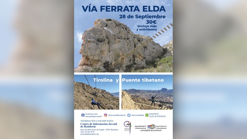 La Concejalía de Juventud del Ayuntamiento de Benidorm ha organizado una nueva actividad que se desarrollará el próximo 28 de septiembre en la localidad alicantina de Elda. En concreto, la actividad será en una Vía Ferrata que transcurre ascendiendo de forma vertical y progresivamente por una cresta que ofrece unas vistas únicas.