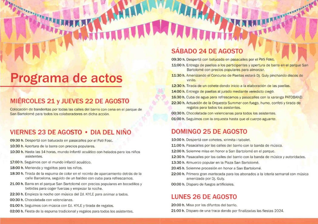El barrio del Pati Fosc se engalana este fin de semana para vivir sus días grandes de fiesta en honor a San Bartolomé. Esta noche empiezan los actos con la cena popular de los vecinos en el parque de la ermita de San Bartolomé. Y el viernes arrancará la jornada con la despertá y los más pequeños disfrutarán de atracciones infantiles durante todo el día, con hinchables acuáticos y espuma de colores. Por la noche, la velada será amenizada por djs y se servirá una chocolatada.