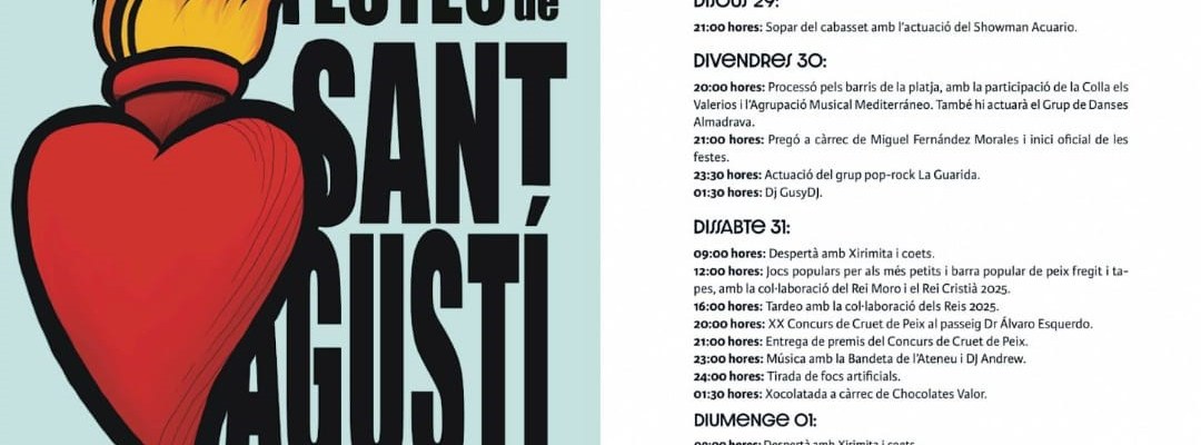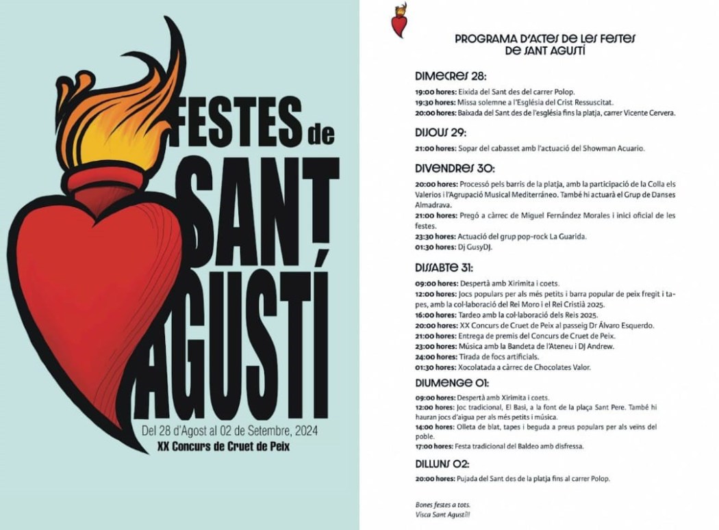 La noche del jueves tendrá lugar el típico “sopar de cabasset” por parte de los vecinos de la playa, cuya velada estará animada por el showman Acuario. El viernes, se celebrará la procesión, en la que la imagen del San Agustín recorrerá las calles del barrio y, a continuación, tendrá lugar el pregón de las fiestas a cargo del pregonero 2024, Miguel Fernández Morales. La fiesta continuará con la actuación en directo del grupo de música pop-rock La Guarida.