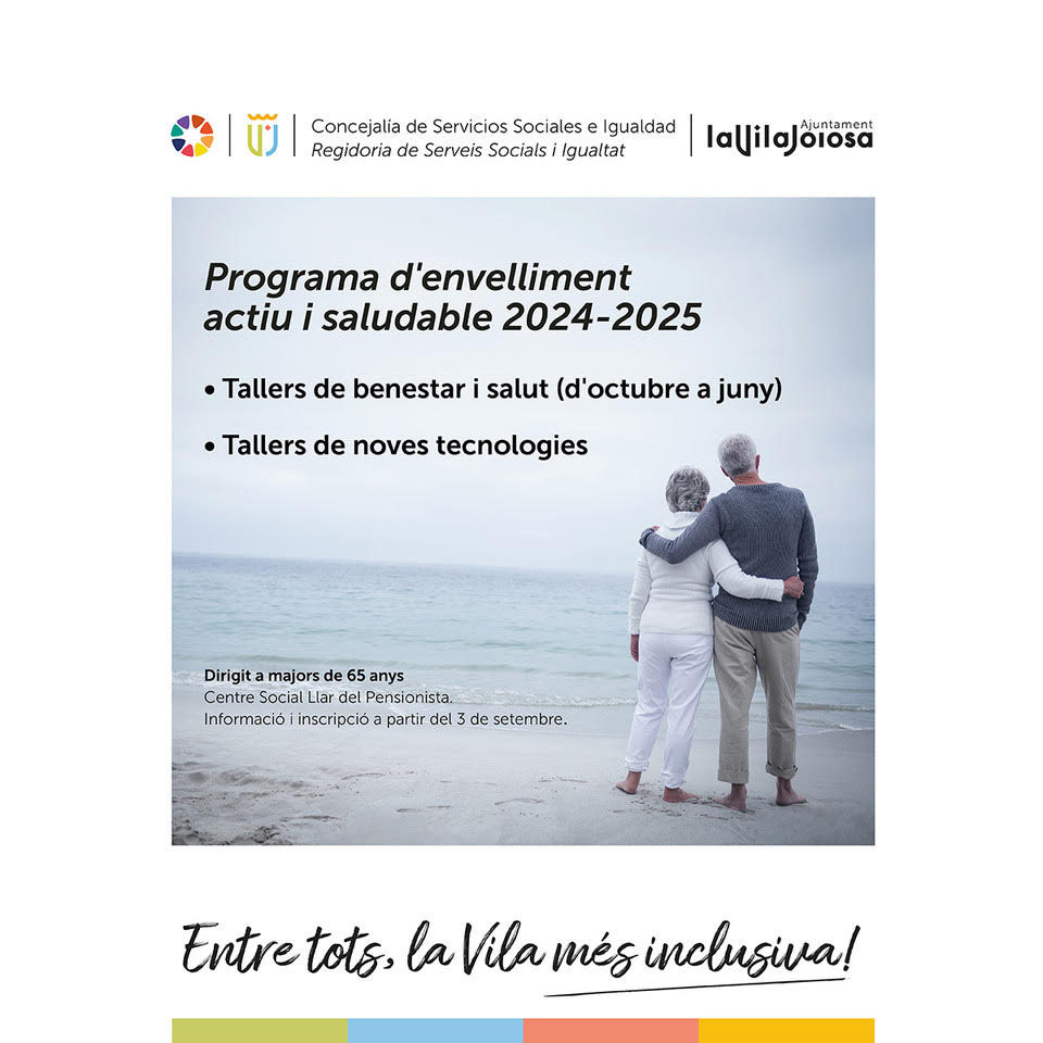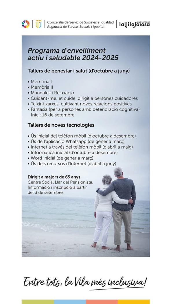 El próximo martes, 3 de septiembre, se abre el período para inscribirse en los talleres de la nueva edición del Programa para un Envejecimiento Activo y Saludable que ofrece la concejalía de Servicios Sociales e Igualdad del Ayuntamiento de Villajoyosa. Este plan de 12 actividades está dirigido a las personas mayores de 65 años, quienes podrán inscribirse en el centro social Llar del Pensionista, donde también se impartirán los cursos.