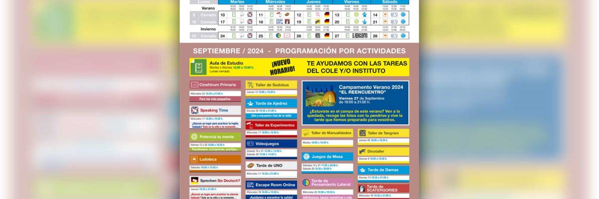 La Concejalía de Juventud del Ayuntamiento de Benidorm ya ha completado la programación del mes de septiembre del Espai Jove, un servicio cuyo principal objetivo es facilitar a todos los jóvenes un espacio en el que, además de poder realizar sus tareas escolares con el apoyo y ayuda de los monitores, también sirva como punto de encuentro y reunión con otros jóvenes y llevar a cabo actividades programadas de ocio educativo como talleres de manualidades, cinefórum, charlas, videojuegos, ludoteca, cuentacuentos, aprendizaje de idiomas, etc.