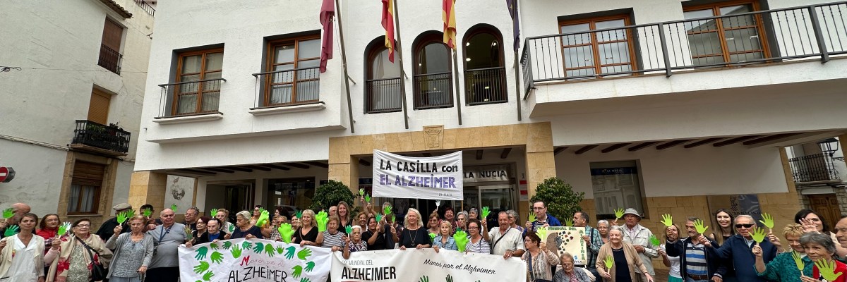 Esta mañana en la plaça Major de La Nucía se ha conmemorado el “Día Mundial del Alzheimer”. Con el acto celebrado hoy, el Ayuntamiento de La Nucía se ha sumado a la campaña “Manos por el Alzheimer” de AFA Marina Baixa (Asociación de Enfermos de Alzheimer de la Marina Baixa), en la que han participado usuarios de la Casilla, Centro de día y de la Residencia Savia. Para dar visibilidad a esta enfermedad paralelamente esta semana los edificios municipales y rotondas se iluminarán de verde, sumándose a la campaña nacional.