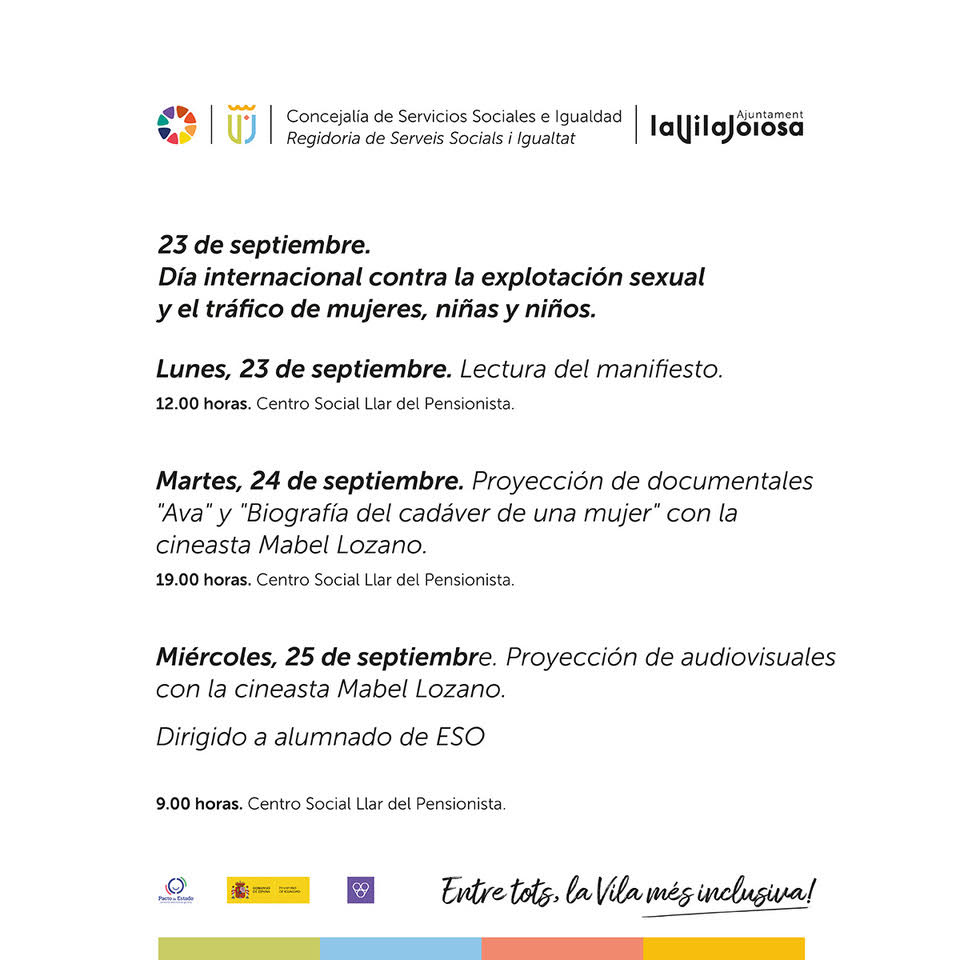El miércoles, se organizará la sesión “Ponte en su piel”, dirigida al alumnado de educación secundaria de los tres institutos del municipio. La cineasta les presentará los audiovisuales “Biografía del cadáver de una mujer”, “Con la trata no hay trato”, “Eso no es sexo”, “Te creo”, así como campañas TiktokTrata con el fin de debatir con ellos sobre esta lacra social. Será a las 9.00 horas en el centro social Llar del Pensionista.