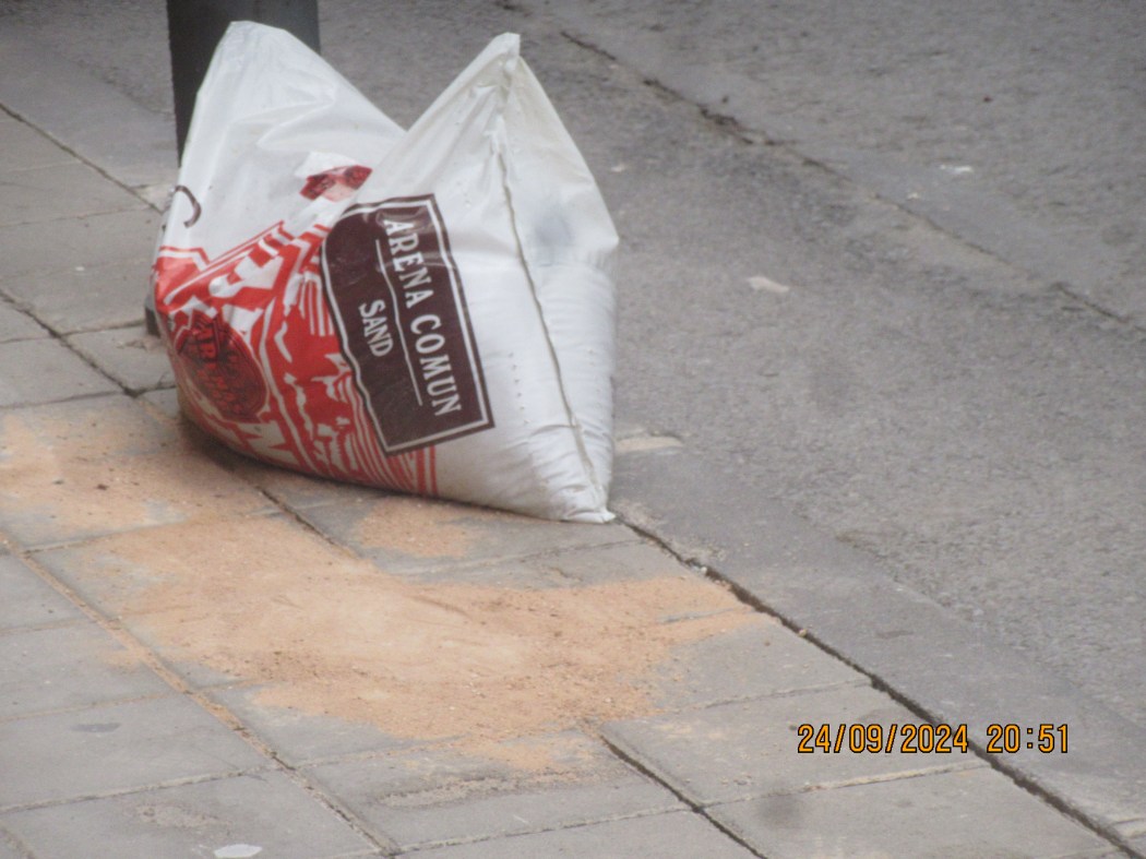 EN LA CALLE DELCOLEGIO LA carmelitas, juntamente en la parada del bus, hay un saco de arena fina que ¡supongo! fue dejado, ¡mejor abandonado! por los festeros. Son demasiados días para los empleados del FCC no lo haya visto y retirarlo como es su obligación y el consiguiente concejal responsable igualmente.