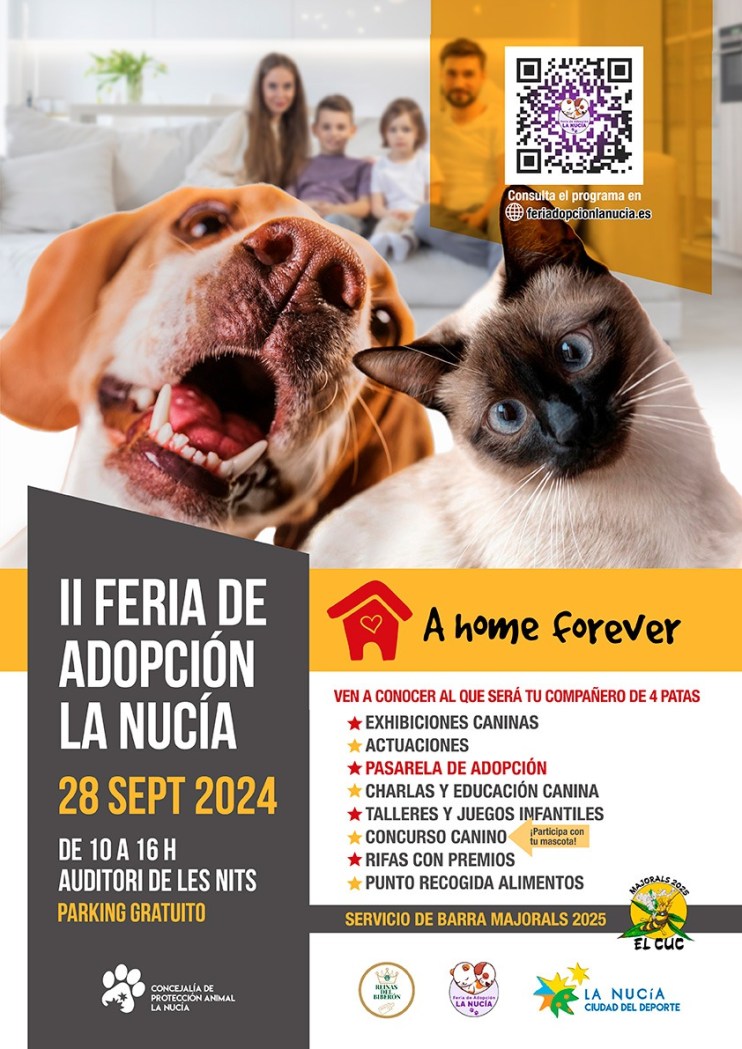 Cabe destacar la colaboración dels Majorals 2025-Penya El Cuc, que darán servicio de barra durante todo el evento (con opciones veganas) para que todos los asistentes puedan reponer fuerzas durante toda la jornada de la Feria (desayuno, almuerzo y comida). Esta II Feria de Adopción Animal contará con la actuación desinteresada de la Escuela de Danza de La Nucía de Beatriz Vaello, así como del Club Agility La Nucía que realizará una exhibición canina y de GEIR K-9 Grupo de Rescate que darán una charla sobre “Perros de Rescate Adoptados”.