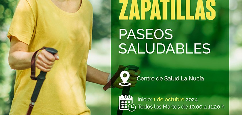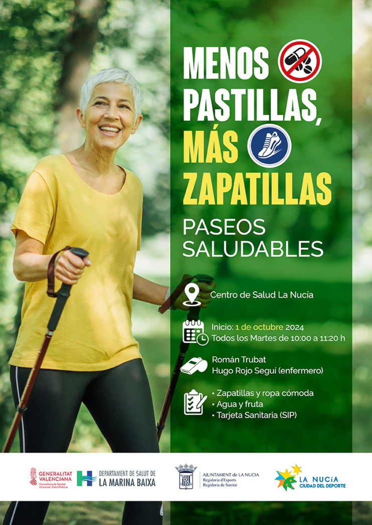 El horario de los paseos saludables de la “Menos Pastillas, Más zapatillas” será los martes de 10 a 11,20 horas, con salida y llegada frente al Centre de Salut de La Nucía, en la plaça de Les Nits. Se efectuará todos los martes y serán paseos de aproximadamente una hora. Los requisitos para participar en esta actividad totalmente gratuita son: zapatillas y ropa cómoda, agua y fruta y la tarjeta sanitaria (SIP).