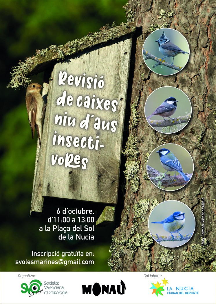 Este domingo 6 de octubre de 11 a 13 horas en la plaza del Sol se realizará la actividad de revisión de cajas nido de aves insectívoras. La jornada estará asistida por monitores y técnicos de la Societat Valenciana d’Ornitologia y en ella se podrá aprender un poco más en detalle de la vida de las aves que anidan o que crían en La Nucía. Esta actividad es gratuita y las inscripciones se realizan en el mail svolesmarines@gmail.com