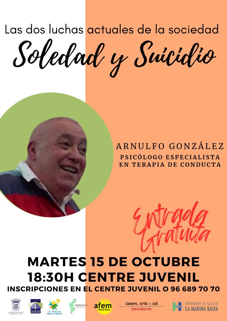 El próximo martes 15 de octubre a las 18,30 horas el Centre Juvenil acogerá la sesión “Las dos luchas actuales de la sociedad. Soledad y suicidio” a cargo de Arnulfo González, Psicólogo Especialista en Psicología Clínica. Esta charla se engloba dentro de las actividades programadas por el Ayuntamiento de La Nucía en el Mes Mundial de la Salud Mental. La charla será con entrada gratuita previa inscripción en el Centre Juvenil, en el teléfono 966897070 o vía mail en juventud@lanucia.es
