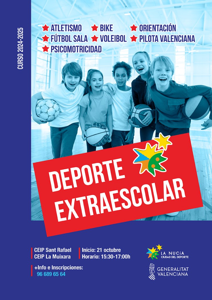 Atletismo, Bike, Orientación, Fútbol Sala, Voleibol, Pilota Valenciana y Psicomotricidad (5 años) son las actividades ofertadas por la Generalitat Valenciana y la concejalía de Educación, organizadas con la colaboración de las AMPAS de los colegios públicos para este curso 2024-2025. Las actividades son totalmente gratuitas para el alumnado y han empezado esta semana. El Ayuntamiento de La Nucía destina 105.180 euros en este “Proyecto Municipal de Actividades Extraescolares y Complementarias 2024-2025”.