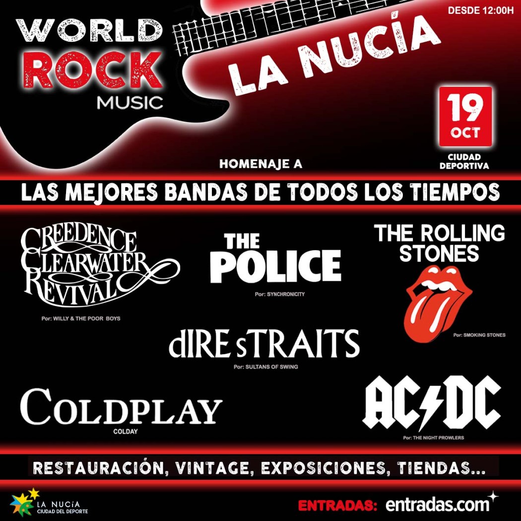 World Rock Music es un encuentro con la música, con diferentes grupos que rendirán homenaje a las bandas más grandes de la historia del rock: Creedence Clearwater Revival, The Police, The Rolling Stones, Dire Straits, Coldplay y AC/DC. Se desarrollará en el Pabellón Muixara y una gran carpa situada en el parking colindante. La apertura de puertas será a las 12 horas y las actuaciones musicales arrancarán a las 12,30 hasta las 24 horas. 11 horas de música en directo, donde sonarán las míticas canciones de las bandas más legendarias de la historia del rock.
