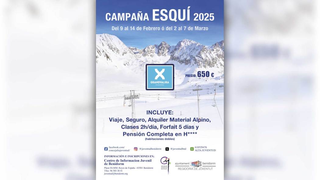 La Concejalía de Juventud del Ayuntamiento de Benidorm ha dado a conocer los viajes que ha organizado con motivo de la Campaña de Esquí 2025. En esta ocasión se trata de dos viajes a la estación de Grand Valira, en Andorra, que tendrán lugar del 9 al 14 de febrero y del 2 al 7 de marzo.