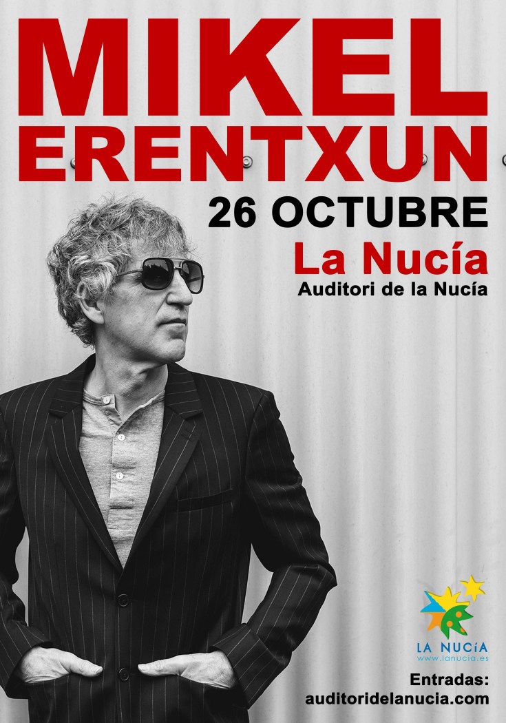 El donostiarra Mikel Erentxun actuará este sábado 26 de octubre a las 20 horas en l’Auditori de La Nucía. Este cantante cuenta con una carrera de más de 40 años en la música, primero con Duncan Dhu, grupo con el que tuvo una exitosa trayectoria con discos y giras y luego en solitario.