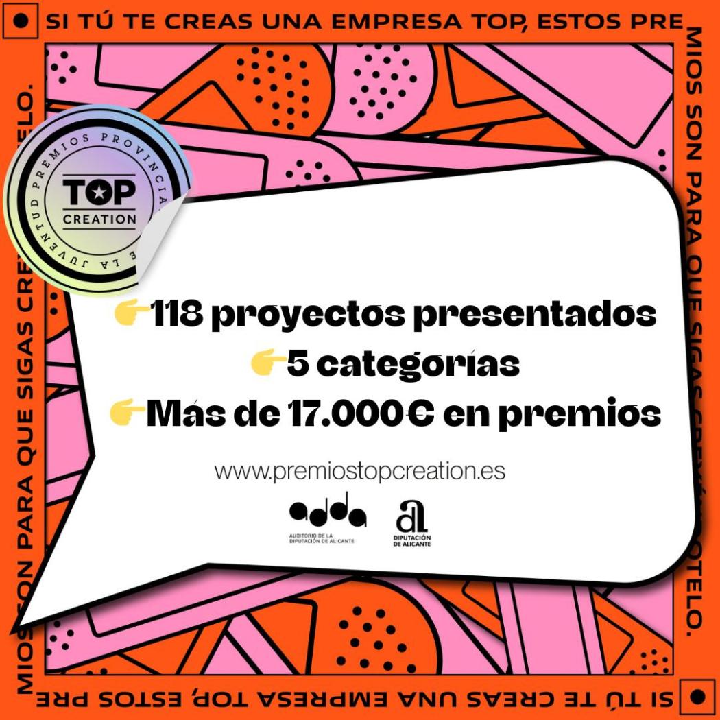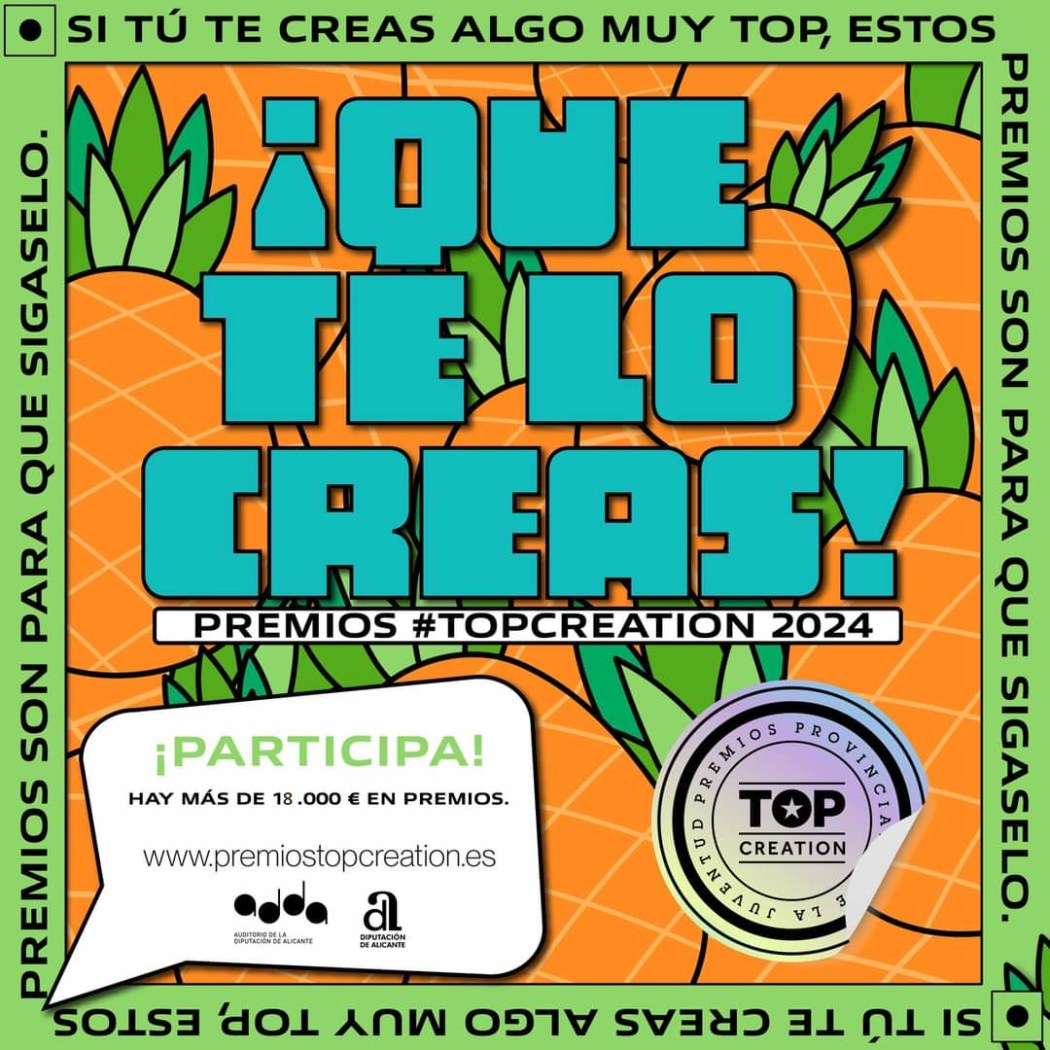 Los premios #TopCreation2024 se estructuran en cinco categorías y varios premios dentro de cada una de ellas. Las distinciones en Iniciativa Empresarial, Social Media, Trabajo Musical -Solista y Grupo-, Relato Breve y Fotografía Digital se desvelarán mañana en una noche en la que se repartirán 18.000 euros en premios.