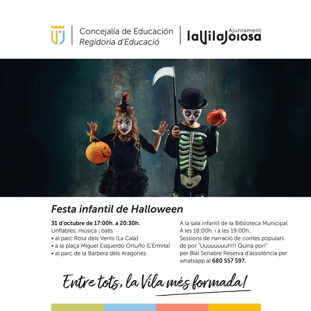 Una fiesta de disfraces, con música, atracciones hinchables y bailes animará a los más pequeños en la tarde más terrorífica del año. Este jueves, 31 de octubre, la concejalía de Educación ha preparado diversas actividades para celebrar Halloween en tres localizaciones diferentes del municipio. Las fiestas se celebrarán de las 17.00 a las 20.30 horas en el parque de la Rosa del Vents, en La Cala, en la plaza Miguel Esquerdo Ortuño, en el barrio de La Ermita, y en el parque de La Barbera dels Aragonés.