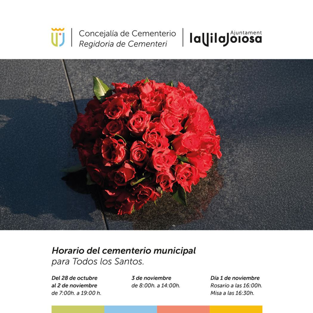 El cementerio municipal de Villajoyosa amplía su horario desde el lunes 28 de octubre y hasta el domingo 3 de noviembre con motivo de la celebración del Día de Todos los Santos. Con el fin de facilitar la visita de todos los vecinos durante los días previos y posteriores a la festividad del 1 de noviembre, el cementerio abrirá de manera ininterrumpida de las 7.00 y hasta las 19.00 horas desde el lunes 28 de octubre y hasta el sábado 2 de noviembre. El domingo 3 de noviembre, el horario de apertura será de las 8.00 hasta las 14.00 horas.
