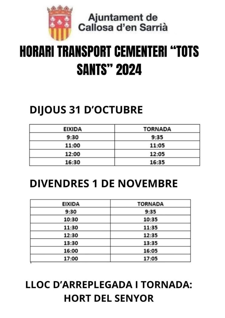 Durante el jueves 31 de octubre y el viernes 1 de noviembre, festividad de Todos los Santos, el autobús municipal de Callosa ofrecerá 22 servicios para así facilitar la movilidad al camposanto. El lugar de salida y llegada de este transporte gratuito será la parada de l’Hort del Senyor, en la Carretera de Bolulla.