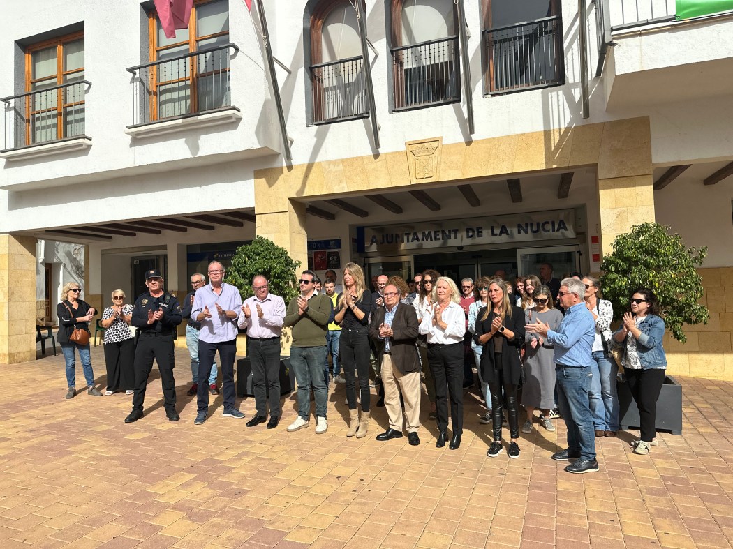 El acto ha contado con la presencia de concejales de la Corporación Municipal, policías, funcionariado y ciudadanía, que han guardado un solemne minuto de silencio a las 12 horas en las puertas de la Casa Consistorial de La Nucía. De esta forma se ha querido mostrar el apoyo y solidaridad con las familias de las víctimas que han provocado las fuertes lluvias y tormentas de la DANA. También para la pronta localización de quienes se hallan desaparecidos y en consideración a cuantos han perdido sus hogares por efecto del temporal.