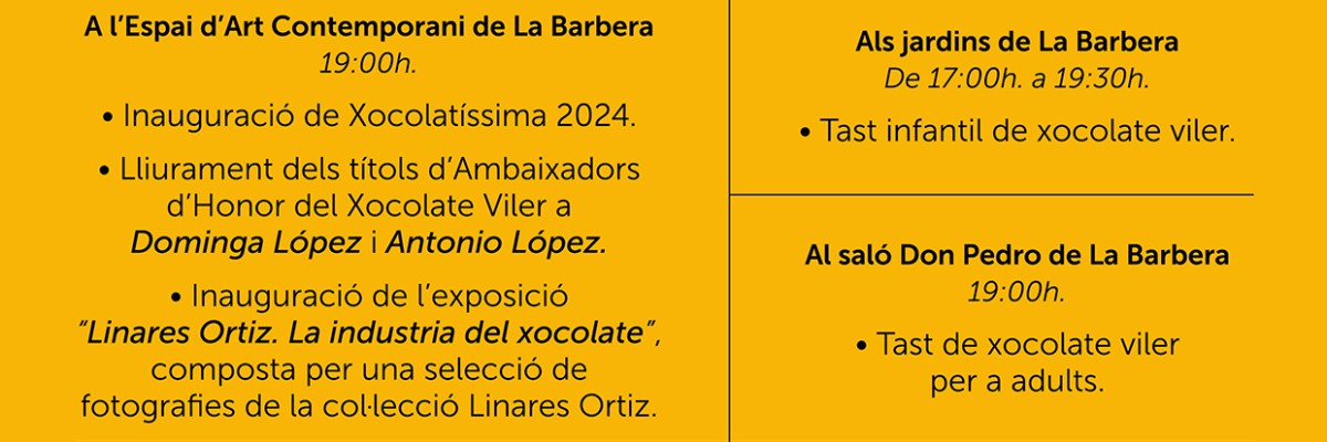 La agenda de Xocolatíssima 2024 arrancará el jueves 14 de noviembre con un acto en el que el Alcalde Marcos Zaragoza entregará los títulos de Ambaixador d’Honor del Xocolate Viler a Dominga López y Antonio López, dos personas vinculadas a la industria del chocolate a lo largo de sus vidas. El acto se celebrará a las 19.00 horas en el Espai d’Art Contemporani de La Barbera, donde también se inaugurará la exposición “Linares Ortiz. La indústria del xocolate”, formada por una selección de 32 fotografías de la colección Linares Ortiz, depositada en Vilamuseu. A las 20.00 horas el reconocido pastelero y repostero Rafa Gorrotxategi impartirá la charla “Historia del chocolate a través del turrón” en el salón don Pedro de la casa de La Barbera, donde, a continuación, se ofrecerá una degustación de productos de Turrones Carremi. Esta actividad estará limitada al aforo de la sala.