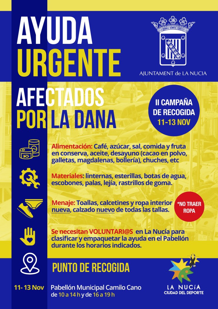 El Ayuntamiento de La Nucía ha organizado una II Campaña de Recogida de Ayuda Urgente para afectados por la DANA, del lunes 11 al miércoles 13 de noviembre en el Pabellón Camilo Cano. Para esta II Campaña se requiere alimentos específicos (café, azúcar, sal, cola cao, magdalenas, galletas…etc.) material (linternas, esterillas, botas de agua, lejía, palas, escobones…) y menaje nuevo (toallas, calcetines y ropa interior nueva y calzado nuevo). Además se necesitarán voluntarios y voluntarias en La Nucía para clasificar y empaquetar la ayuda en el Pabellón, durante los días indicados.