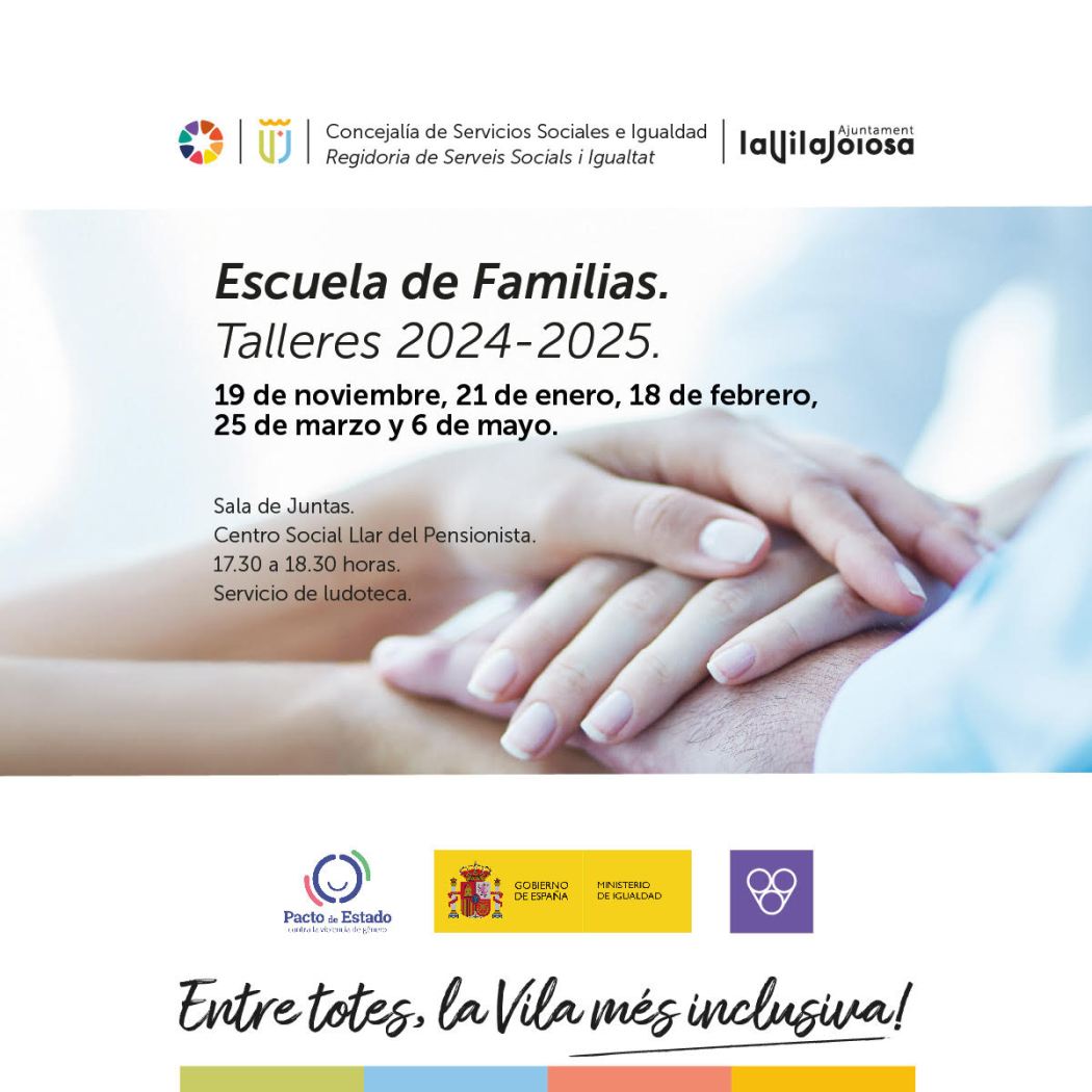 El próximo martes, 19 de noviembre, arranca el programa de actividades “Escuela para familias” que organiza la concejalía de Servicios Sociales e Igualdad. Este plan de cinco talleres didácticos está dirigido a la comunidad escolar, tanto al alumnado, los padres y madres, así como al profesorado, quienes podrán inscribirse a través de formularios digitales para participar en las sesiones que se impartirán en el centro social Llar del Pensionista. El objetivo de este programa es dar conocer y facilitar las claves para solucionar problemas o saber tratar con los hijos o el alumnado adolescente asuntos tan actuales y preocupantes como el uso de los dispositivos móviles, el acceso a la pornografía o las relaciones sexuales.