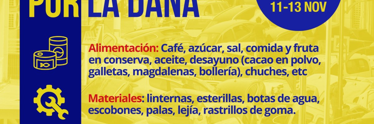 Hoy miércoles 13 de noviembre finaliza II Campaña de Recogida de Ayuda Urgente para afectados por la DANA, cuyo punto de recogida se ha ubicado en el Pabellón Camilo Cano. Para esta II Campaña se requiere alimentos específicos (café, azúcar, sal, cola cao, magdalenas, galletas…etc.) material (linternas, esterillas, botas de agua, lejía, palas, escobones…) y menaje nuevo (toallas, calcetines y ropa interior nueva y calzado nuevo).