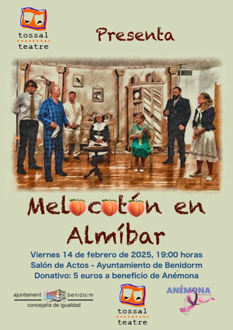 El grupo Tossal Teatre, dirigido por Manuel Palazón, representará el próximo viernes, día 14 de febrero, la conocida comedia de Miguel Mihura titulada “Melocotón en almíbar”. A las 7 de la tarde, en el salón de actos del ayuntamiento de Benidorm. La entrada-donativo será de cinco euros a beneficio de Anémona.