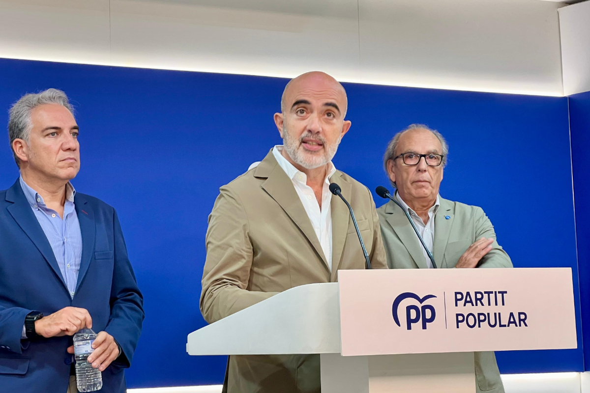 El líder del PP en el Ayuntamiento de Barcelona, Dani Sirera, junto al vicesecretario de Coordinación Autonómica y Local del PP, Elías Bendodo, y el secretario general del PP de Barcelona, Josep Tutusaus, en la sede del PP en Catalunya. Europa Press.